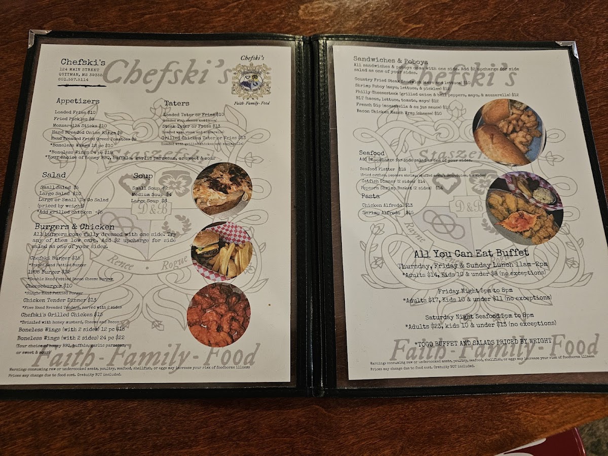 Welcome to Chefski's, a culinary gem nestled at 124 Main St, Quitman, MS. This charming eatery offers an inviting menu that promises something for everyone. Start your meal with tantalizing appetizers like Loaded Fries or Hand Breaded Fried Green Tomatoes, each crafted to ignite your appetite.